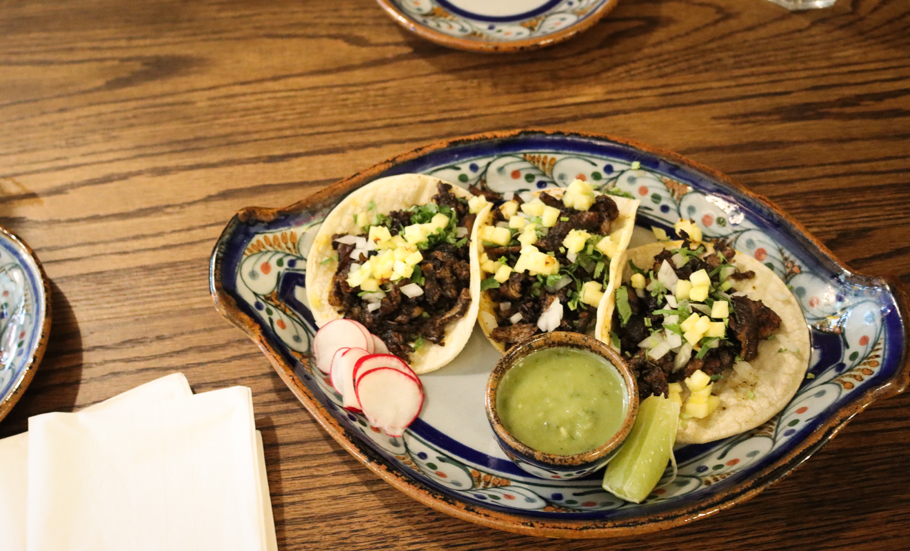 Muchos platos de la carta del restaurante, como el mole Mis Tres Amores de Jiménez, están inspirados en recetas familiares de su infancia. El ambiente del restaurante es cálido, y el espacio está bellamente decorado con fotos, obras de arte, platos hechos a mano y sabanas de vendedores ambulantes en Puebla.