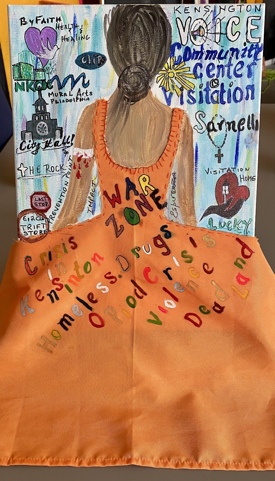 Maria won the category Ages 18+, Individual Entry with a collage of an immigrant woman named Maria wearing a hand-stitched, orange dress with the negative perceptions of Kensington written on it. The artist told Kensington Voice that only God and the nonprofit organizations can change the future of Kensington, but the organizations need more funding from elected officials and donors.