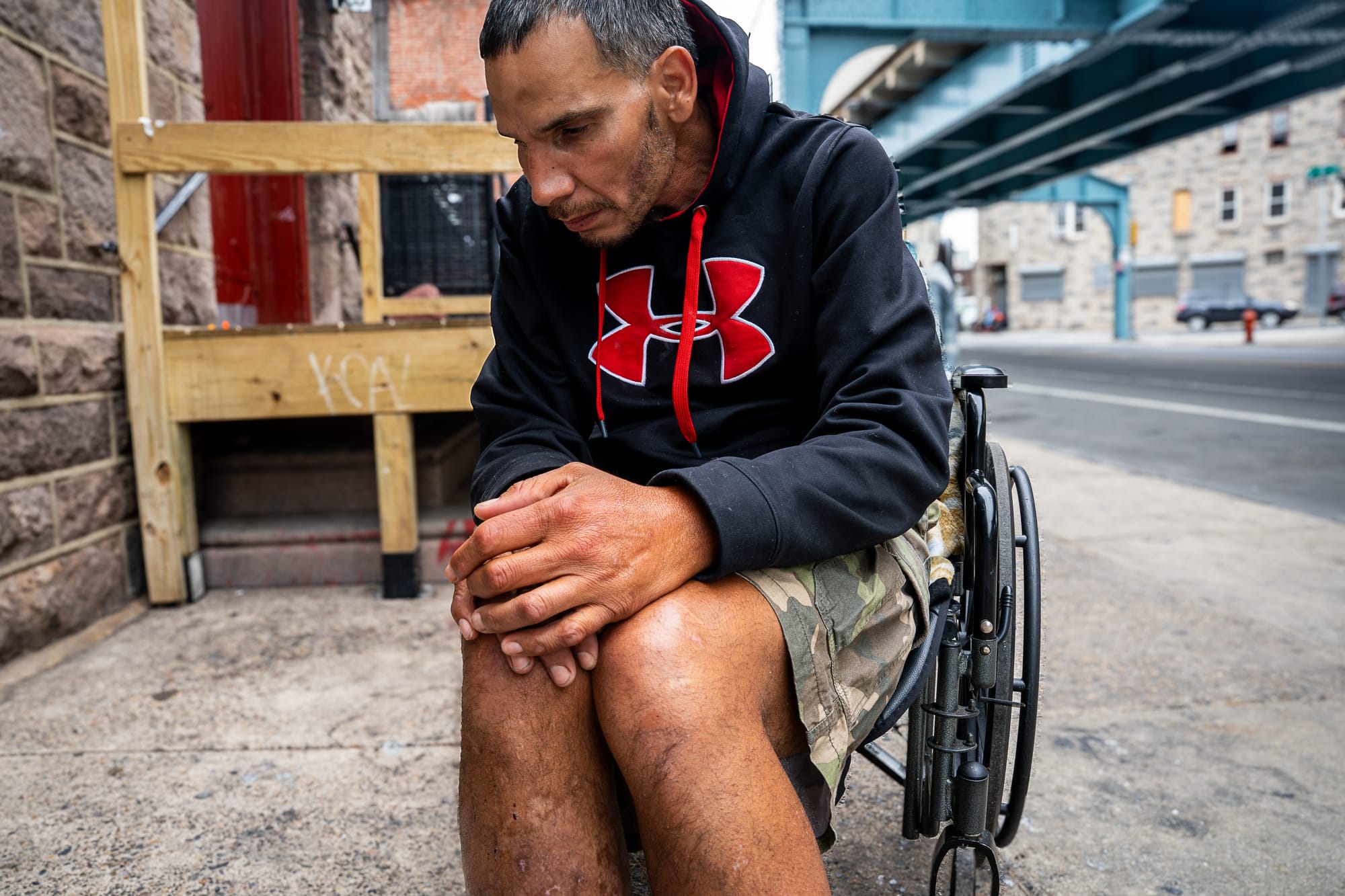 In March, Dominic, 46, was sitting on the sidewalk on Kensington Avenue, leaning against a storefront with a sweatshirt over his legs, when an officer arrested him. He didn’t have a wheelchair that day, which he needs for mobility, so an officer held him up as they walked to her car and hoisted him in.