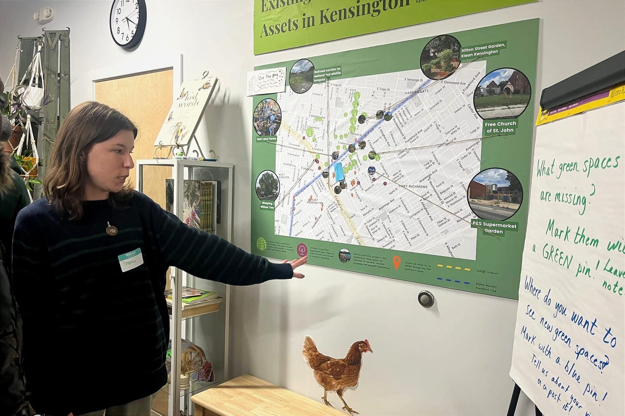 NKCDC also created a neighborhood map and encouraged attendees to add pins and sticky notes with observations about local green spaces. Temple University students from the Office of Sustainability assisted with the interactive display as part of their ongoing partnership with NKCDC’s weekly workshops.