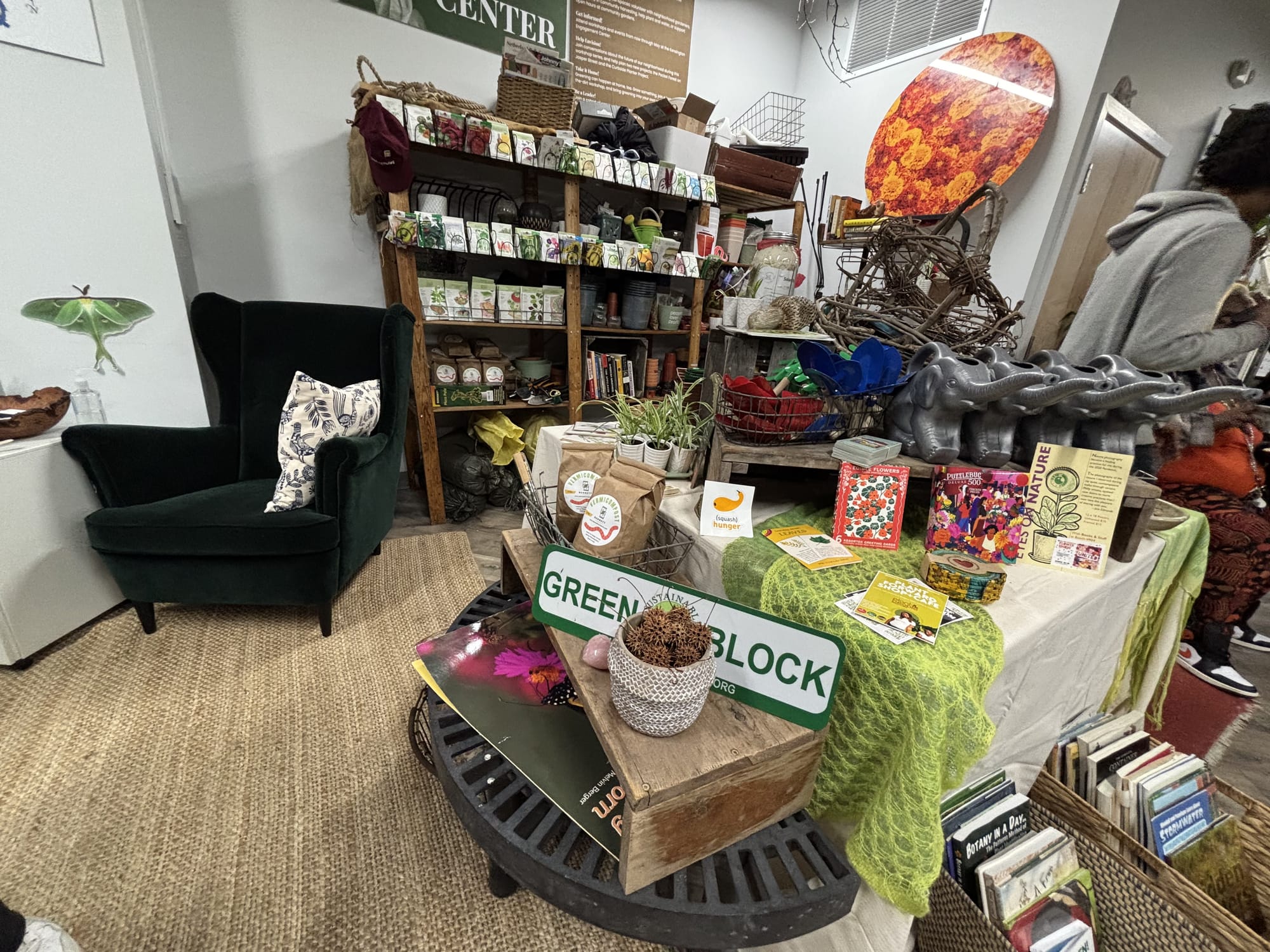 Free seed packets, gardening books, compost, and other resources were available for community members to take home from NKCDC's green space kickoff event in Kensington. (Photo by Safiya Totesau)