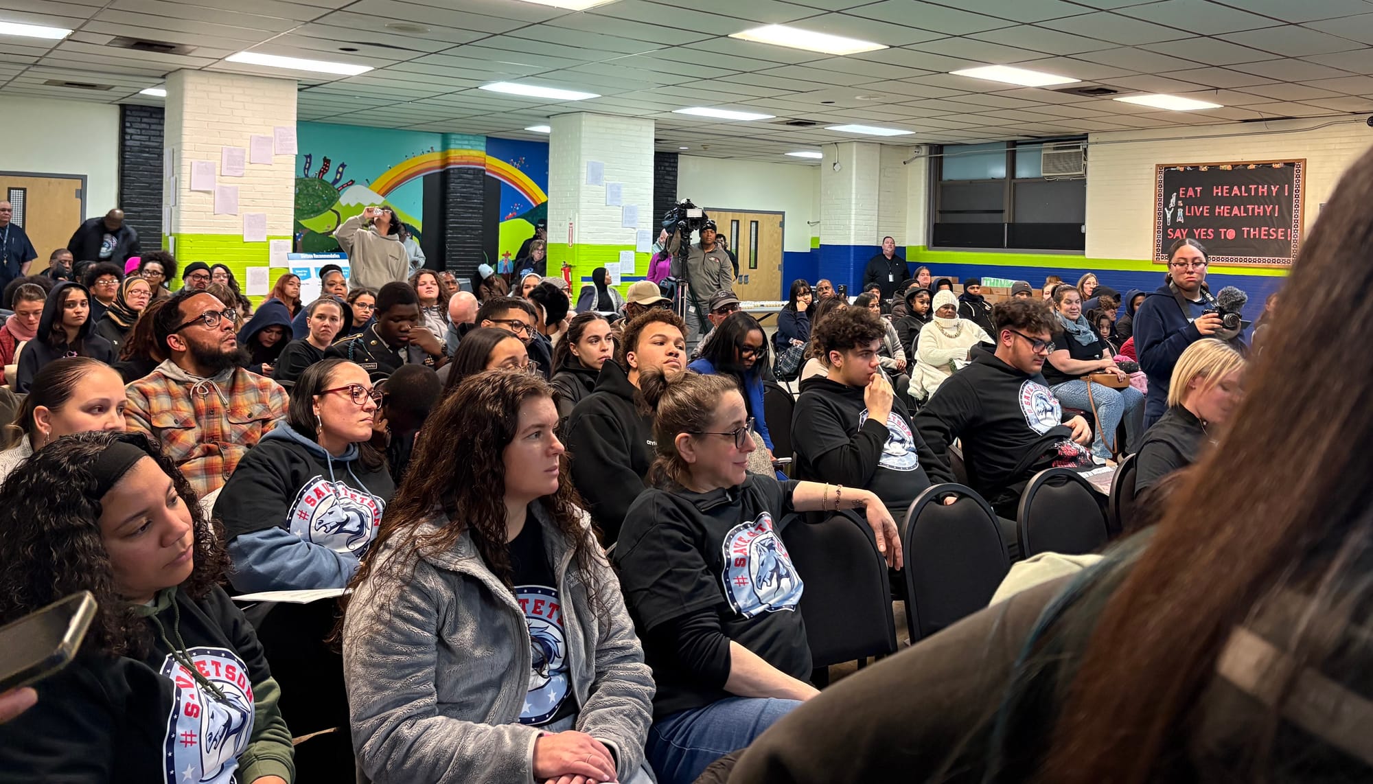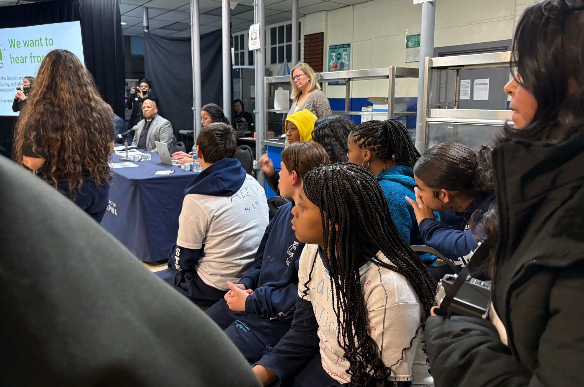 Stetson Middle School students waiting to speak to district officials at a meeting about the school's potential closure on Thursday, February 12, 2026. (Photo by Emily Rizzo)